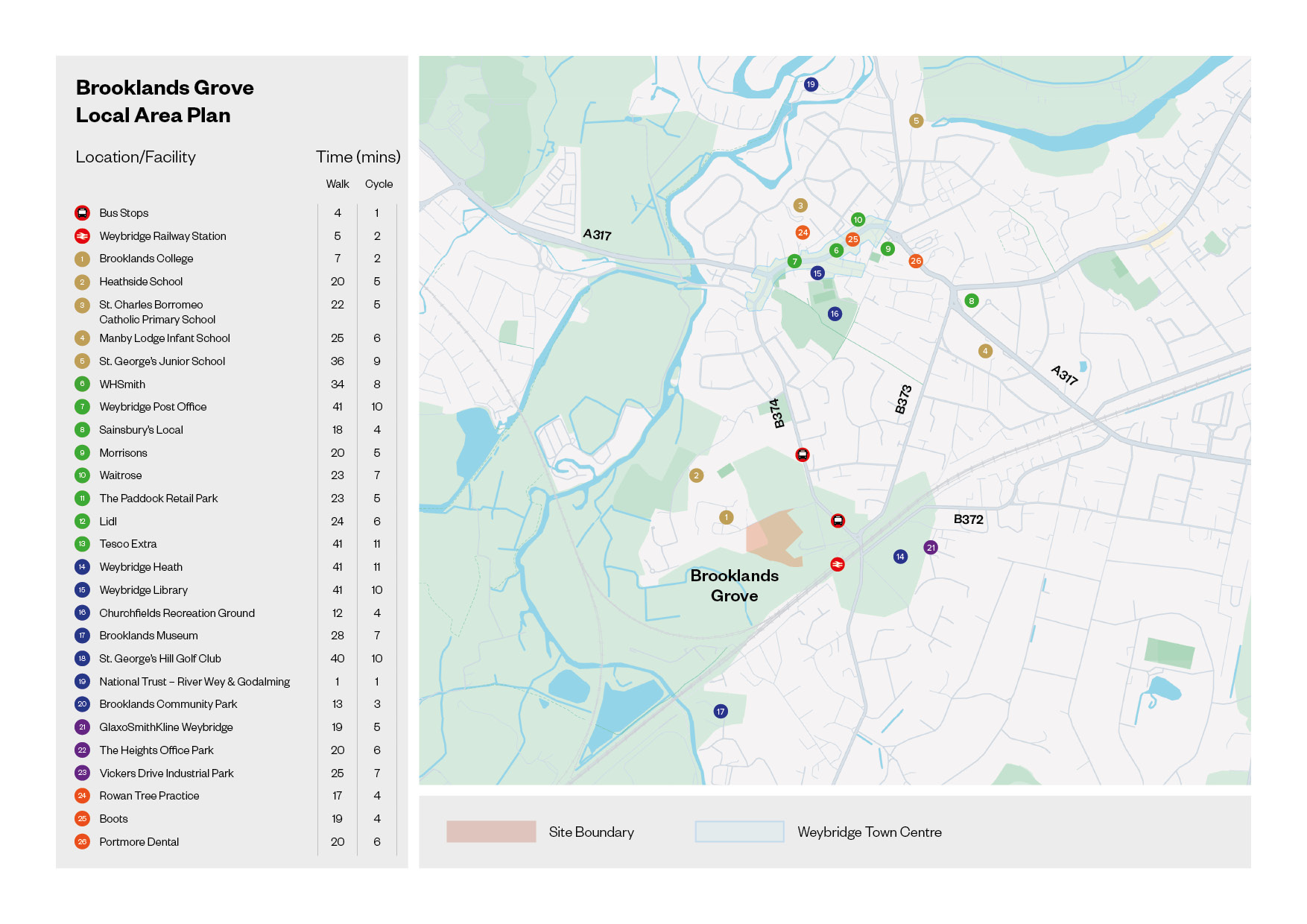 Brooklands Grove is located in central Weybridge and is only a 23 minute walk and a 7 minute cycle ride to Weybridge Town Centre.